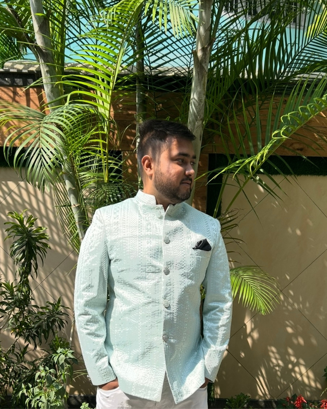 "Step into understated elegance with our Pastel Mint Bandhgala—crafted in a delicately textured fabric that catches the light with every movement. Designed with regal silver buttons and a sharp mandarin collar, this piece is finished with a contrasting black pocket square for a touch of sophistication. Perfect for summer weddings, festive soirées, or elevated daytime celebrations. A signature creation by Zari by Jay — Luxury Redefined."